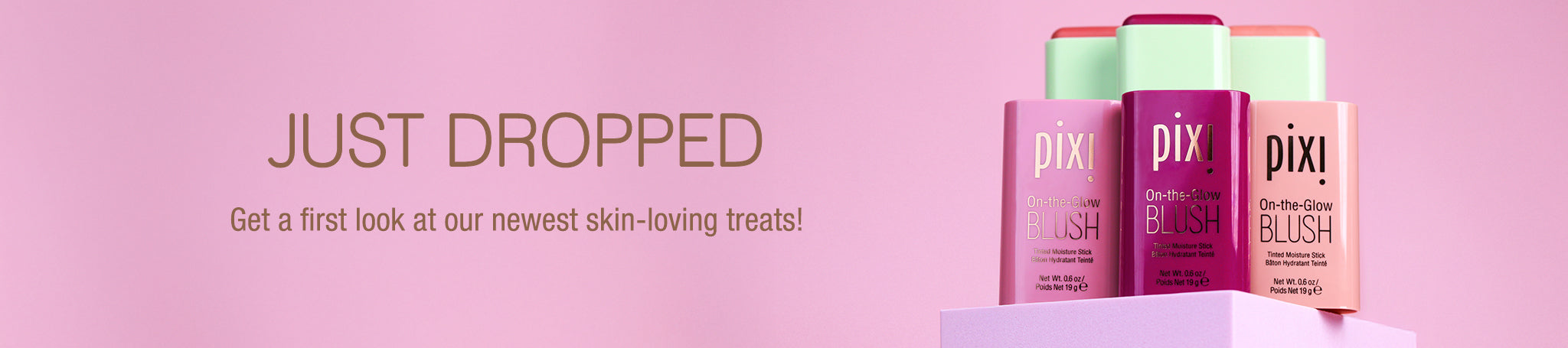Pixi  On-the-Glow Blush in 3 new shades, on a pink background